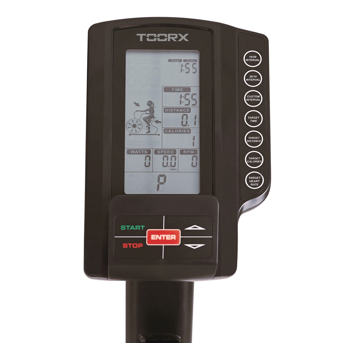 Det brugervenlige LCD-display viser tid, distance, kalorier, hastighed, puls, RPM og watt. Der er indbyggede programmer: manuel, målrettet (tid, kalorier, distance, puls) og tre intervaller (10/20, 20/10, brugerdefineret).