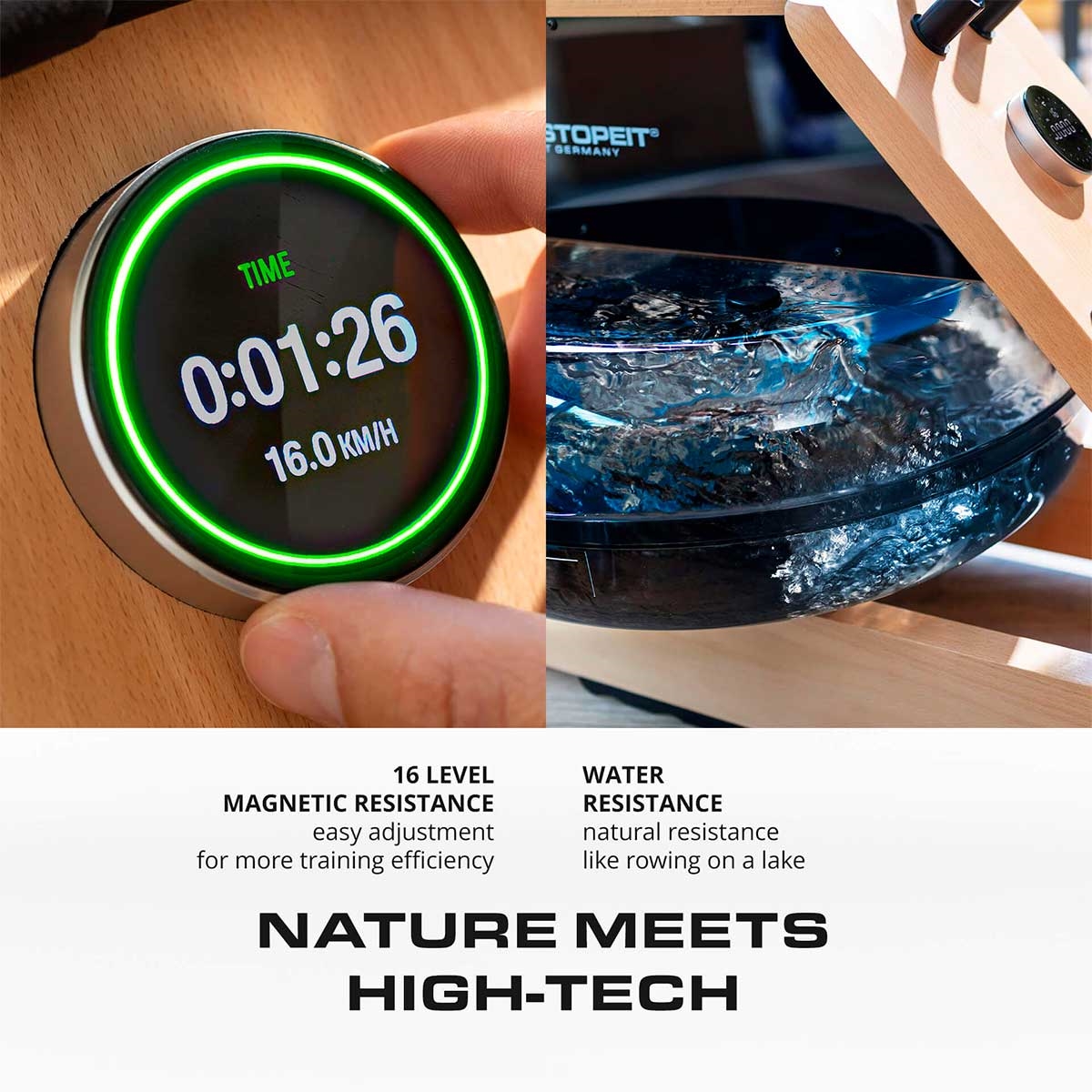 Det unikke kombinationssystem af vand- og 16-trins magnetmodstand giver autentisk ro-følelse og fleksibel justering af træningsintensitet via vandmængde og magnetisk modstand.